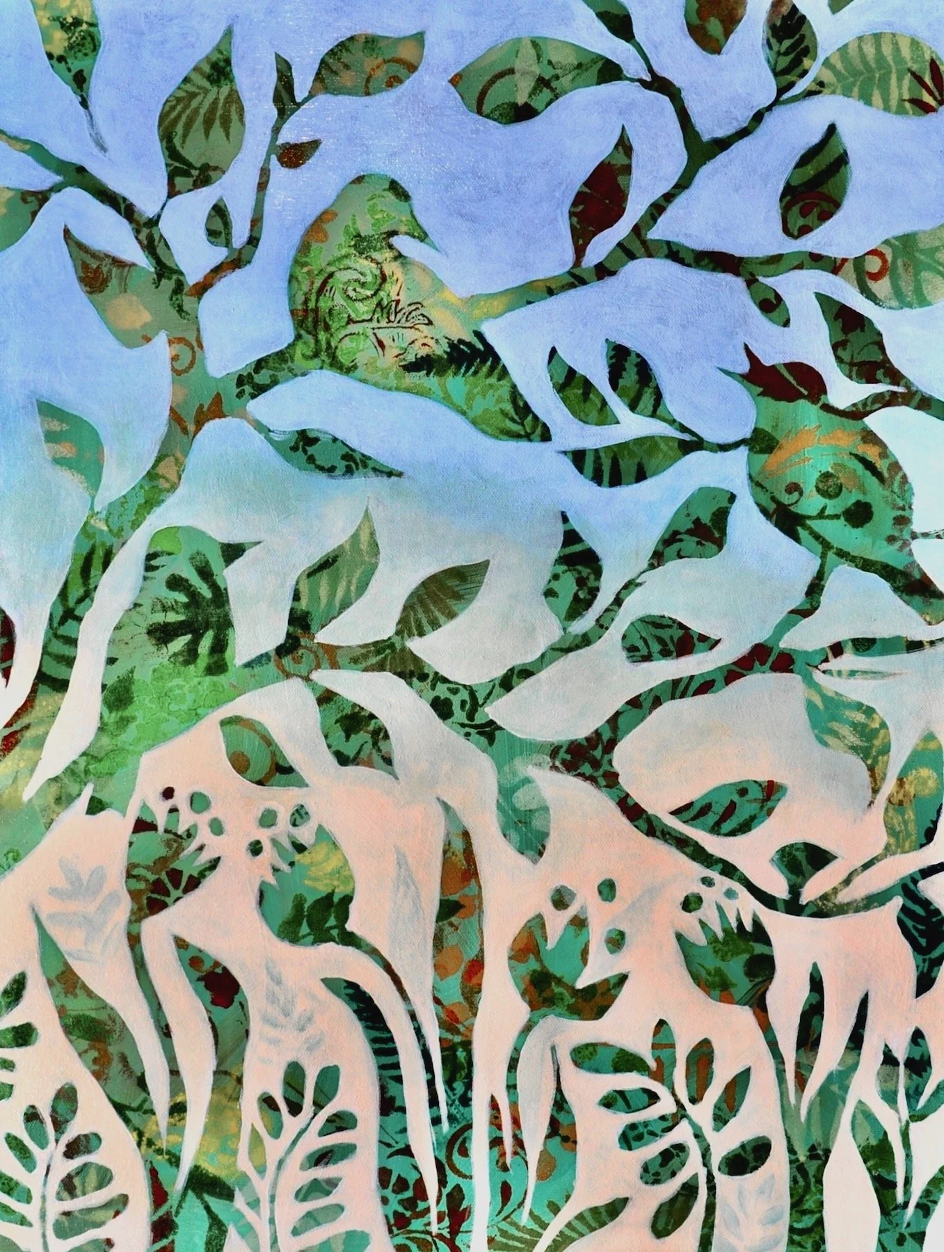 My “negative space” or “over/under” paintings portray the depth of the natural environment in a whimsical, joyful way. They hint at all of the hidden things growing and moving beyond the initial visual plane.